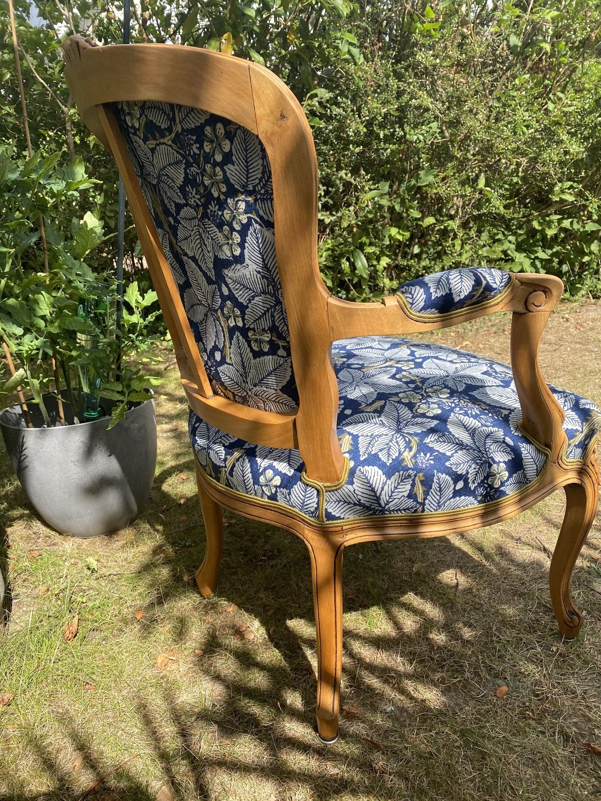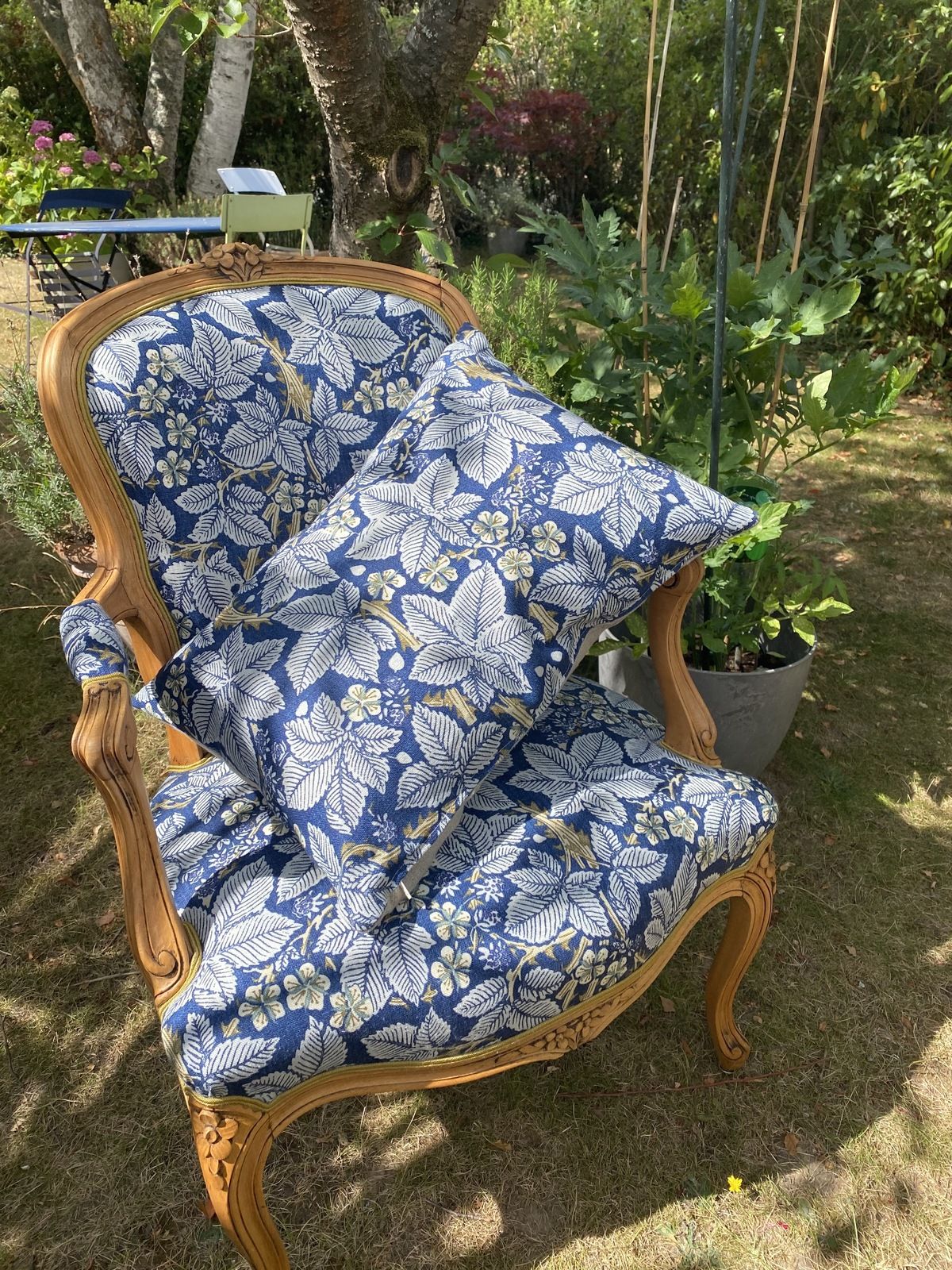 Des fleurs, des fleurs et encore des fleurs: tissu Morris and Co agrémenté d'un double passepoil de la Passementerie Ile de France (fabriqué en France) pour la finition du fauteuil Cabriolet style Louis XV